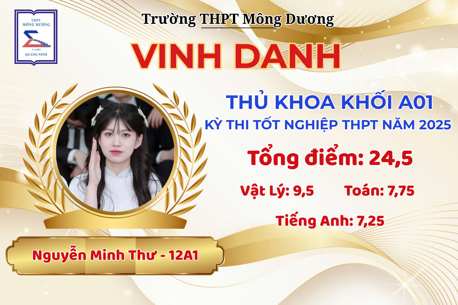 - Nguyễn Minh Thư – 12A1 – Thủ khoa khối A01 – 24,50 điểm