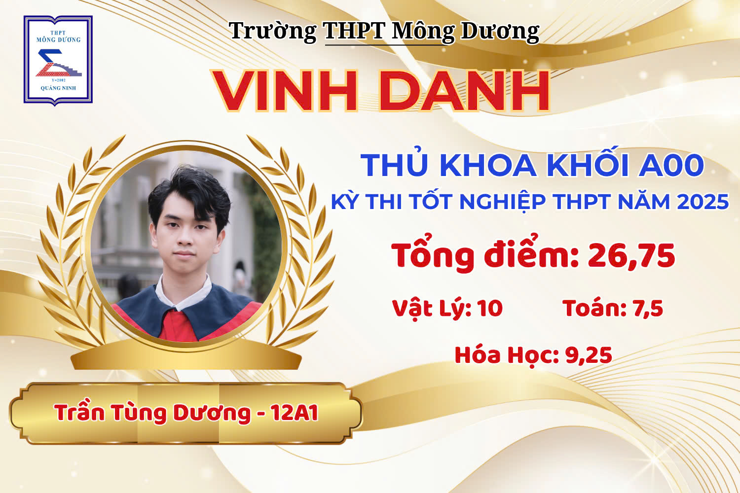 - Trần Tùng Dương – 12A1 – Thủ khoa khối A00 – 26,75 điểm