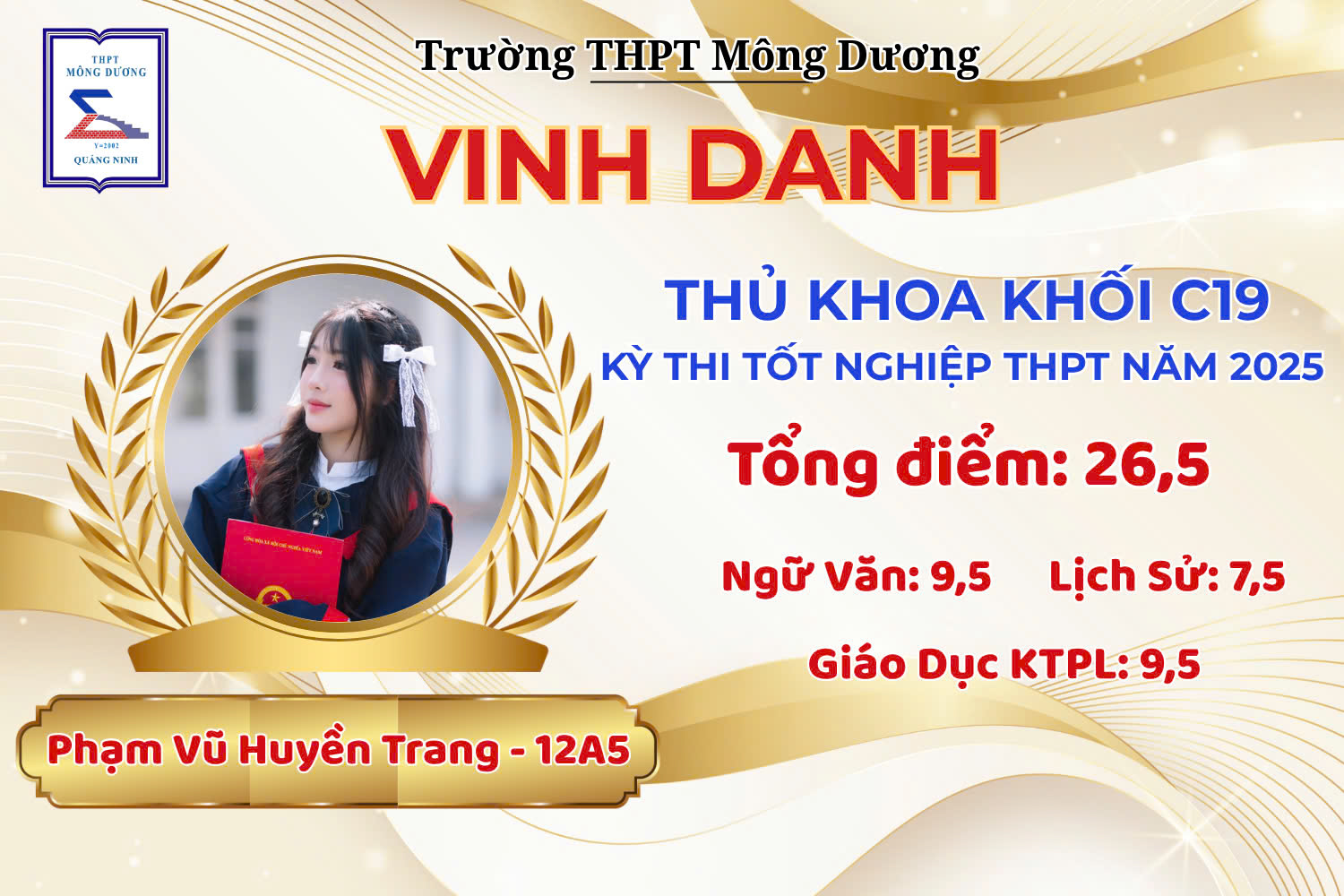 - Phạm Vũ Huyền Trang – 12A5 – Thủ khoa khối C19 – 26,50 điểm