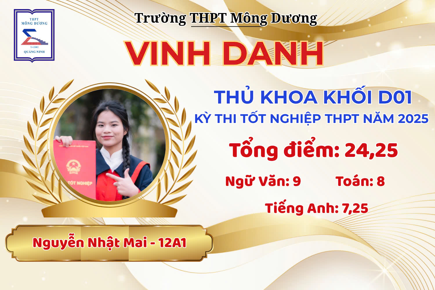 - Nguyễn Nhật Mai – 12A1 – Thủ khoa khối D01 – 24,25 điểm